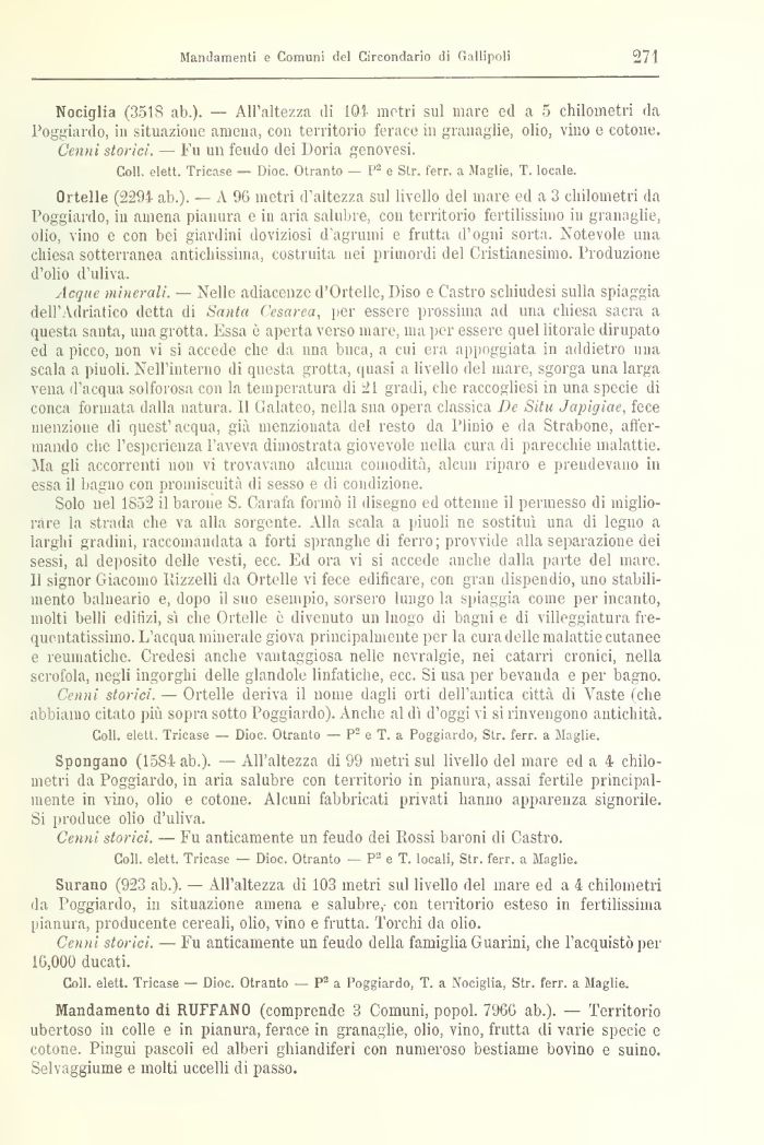Spengano (1584 ab.). — All'altezza di 99 metri sul livello del mare ed a 4 chilometri da Poggiardo, in aria salubre con territorio in pianura, assai fertile principalmente in vino, olio e cotoue. Alcuni fabbricati privati hanno apparenza signorile. Si produce olio d'uliva.
