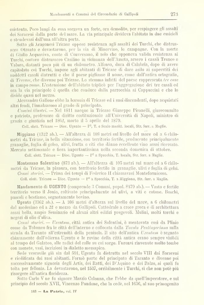 Ugento (3302 ab.). — A 108 metri d'altezza sul livello del mare, a 0 chilometri dal medesimo ed a 22 e mezzo da Gallipoli. Cattedrale a croce greca e di architettura assai bella, ampio Seminario ed alcuni altri editizi pregevoli Mulini, molti torchi e negozi di olio d'uliva.