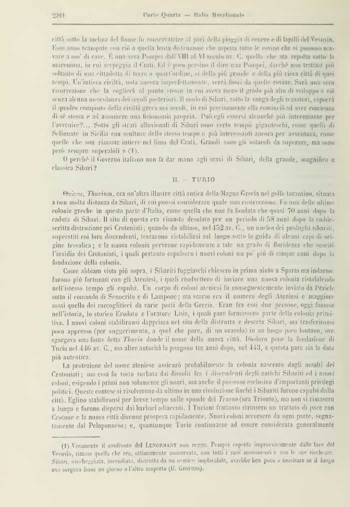 Gbisivc, Thurium, era un'altra illustre città antica della Magna Grecia nel golfo tarantino, situata a non malta distanza da Sibari, di cui puossi considerare quale ima umiito/ioiic. I n una delle ultimi' colonie greche in questa parte d'Italia, come quella clic non fu fondala clic quasi 70 anni dopo la caduta di Sibari. Il silo di questa era rimasto desolato per un periodo di fi8 anni dopo la smble-seritta distruzione pei Croloniali; quando da ultimo, nel i.r)2 av. C., un nucleo dei profughi sibariti, superstiti coi loro discendenti, tentarono ristabilirsi sul luogo sotto la guida di alcuni capi di origine (ossalica ; c la nuova colonia pervenne rapidamente a tale un grado di floridezza clic suscitò l'invidia dei Croloniali, i quali pertanto espulsero i nuovi coloni un po' piti di cinque anni dopo la fondazione della colonia.
