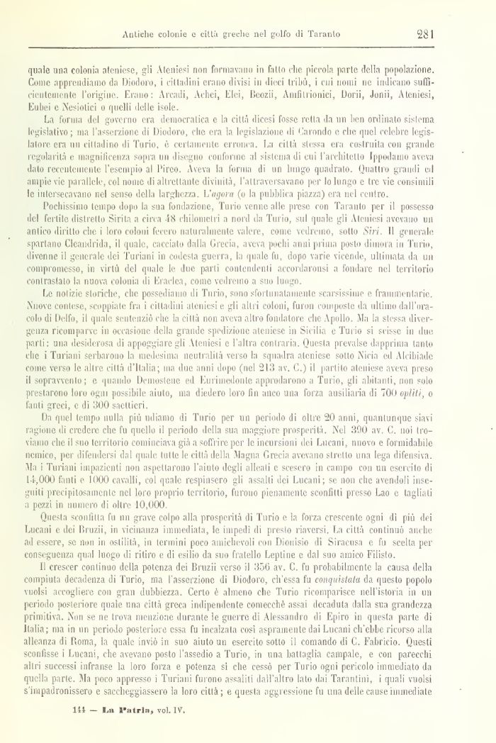 a cura di Federico Adamoli Aderisci al progetto! Antiche colonie e città greche nel golfo quale una colonia ateniese, gli Vleniesi non formavano in fallo clic piccoli parte della popolazione. Come apprendiamo da Diodoro, i cittadini erano divisi in dieci tri',ni, i cui nomi ne indicano sufficientemente l'origine. Erano: Arcadi, Achei, Elei, Beozii, Amliiiionici, Borii, Junii, Ateniesi, Kubei c Nesiotici o quelli delle isole. La forma del governo era democratica c la città dicesi fosse rolla da un ben ordinato sislema legislativo; ina l'asserzione di Diodoro, clic era la legislazione di Carondo e clic quel celebre legislatore era un cittadino di 'furio, è cecamente erronea. La città slessa era costruì® con grande regolarità e magnificenza sopra un disegno conforme al sistema di cui l'arcliiletlo Ippodamo aveva dato recentemente l'esempio al Pireo. Aveva la l'orma di un lungo quadralo. Quattro granili ed ampie vie parallele, col nome ili altrettante divinila, l'attraversavano per lo lungo e Ire vie consimili le intersecavano ne! senso della larghezza. L'agora (o la pubblica piazza) era nel centro. Pochissimo tempo dopo la sua fondazione, Torio venne alle prese con Taranto per il possesso del fertile distretto Sirita a circa 48 chilometri a nord da 'furio, sul quale gli \leniesi avevano un aulico diritto clic i loro coloni fecero natiiralmenle valere, come vedremo, sotto Siri. Il generale sparlano Cleandrida, il quale, caccialo dalla Grecia* aveva pochi anni prima posto dimora in furio, divenne il generale dei Turiani in codesta guerra, la quale fu, dopo varie vicende, ultimata. da un compromesso, in virtù del quale le due parli contendciili accordaronsi a fondare nel territorio contrastato la nuova colonia ili Eraclea, come vedremo a suo luogo. Le nolizie storiche, clic possediamo ili Tnrio, sono sfortunatamente scarsissime e frammentarie. Nuove contese, scoppiate fra i cittadini ateniesi e gli altri coloni, furon composte da ultimo dall'oracolo di Delfo, il quale sentenziò clic la città non aveva altro fondatore clic Apollo. Ma la slessa divergenza ricomparve in occasione della grande spedizione ateniese in Sicilia e 'furio si scisse in due parti: una desiderosa di appoggiare gli Ueniesi e l'altra contraria. Questa prevalse dapprima tanto clic i Turiani serbarono la medesima neutralità verso la squadra alcniesc sotto Nicla ed Alcibiade come verso le altri città d'Italia; ma due anni dopo (nel 21B av. C.) il partilo ateniese aveva preso il sopravvento; e quando Demostene ed Eiirimedonle approdarono a Tnrio, gli abitanti, non solo prestarono loro ogni possibile aiuto, ma diedero loro fin anco una forza ausiliaria di 700 opliti, o fanti greci, e di 300 saetticri. Da quel tempo nulla più udiamo di Tnrio per un periodo di oltre 20 anni, quantunque siavi ragione di credere clic fu quello il periodo della sua maggiore prosperità. Nel .'100 av. C. noi troviamo che il suo territorio cominciava già a soffrire per le incursioni dei Lucani, nuovo e formidabile nemico, per difendersi dal quale tulle le città della Magna Grecia avevano stivilo una lega difensiva. Ma i Turiani impazienti non aspettarono l'aiuto degli alleali e. scesero in campo con un esercito di 14,000 fanti e 1000 cavalli, col quale respinsero gli assalii dei Lucani; se non che avendoli inseguiti precipitosamente nel loro proprio territorio, furono pienamente sconfitti presso Lao e tagliati a pezzi in numero di olire 10,000. Questa sconfitta fu un grave colpo alla prosperità di Torio e la forza crescente ogni dì più dei Lucani e dei Bruzii, in vicinanza immediala, le impedì di presto riaversi. La città continuò anche ad essere, se non in ostilità, in termini poco amichevoli con Dionisio di Siracusa e fu scelta per conseguenza qnal luogo di ritiro e di esilio da suo fratello Lepline e dal suo amico Fi listo. fi crescer continuo della potenza dei Bruzii verso il 356 av. C. fu probabilmente la causa della compiuta decadenza di 'l'uno, ma l'asserzione di Diodoro, ch'essa fu conquistata da questo popolo vuoisi accogliere con gran dubbiezza. Certo è almeno che Tutto ricomparisce nell'istoria in un periodo posteriore quale ima città greca indipendente comecché assai decaduta dalla sua grandezza primitiva. Non se ne trova menzione durante le guerre di Alessandro di Epiro in questa parte di Italia; ma in un periodo posteriore essa fu incalzata così aspramente dai Lucani ch'clile ricorso alla alleanza di Roma, la quale inviò in suo aiuto un esercito sotto il comando di C. Fabricio. Questi sconfisse i Lucani, che avevano posto l'assedio a Turio, in una battaglia campale, e con parecchi altri successi infranse la loro forza e potenza sì che cessò per Turio ogni pericolo immediato da quella parie. Ma poco appresso i Turiani furono assaliti dall'altro lato dai Tarantini, i quali vuoisi s'impadronissero e saccheggiassero la loro città; e questa aggressione fu una delle cause immediate 1» ~ l-a l'atri», voi. IV'. ![]() |