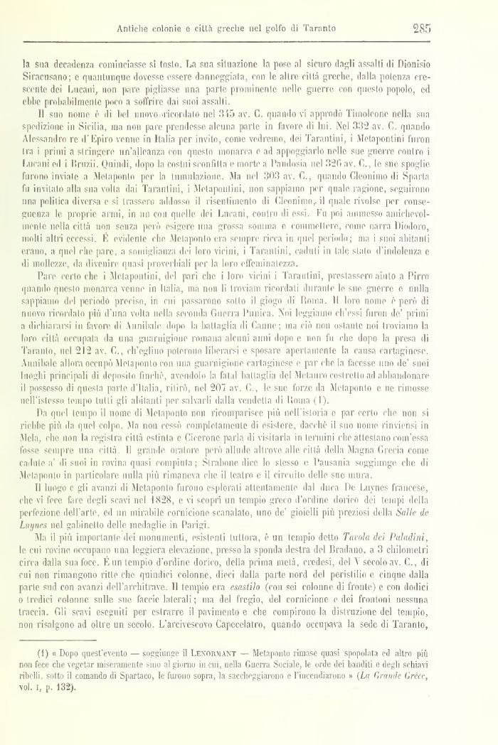 a cura di Federico Adamoli Aderisci al progetto! Antiche colonie e città greche nel golfo la sua decadenza cominciasse si tosto. La sua situazione la pose al sicuro dagli assalti di Dionisio Siracusano; e quantunque dovesse essere danneggiata, con le altre citta greche, dalla potenza crescente dei Lucani, non pare pigliasse una parte prominente nelle guerre con questo popolo, ed ebbe probabilmente poco a soffrire dai suoi assalii. Il suo nome è ili bel nuovo-.ricordalo nel 315 av. C. quando u approdò Timolcone nella sua spedizione in Sicilia, ma non pare prendesse alcuna parte in favore di Ini. Nel 332 av. fi. panda Alessandro re d'Epiro venne in Italia per invito, come vedremo, dei Tarantini, i Melapontini fnran tra i primi a stringere un'alleanza con questo monarca e ad appoggiarlo nelle sue guerre contro i Lucani ed i llruzii. Quindi, dopo la costui sconfina e morte a Pandosia nel 320 av. E., le sue spoglie furono inviale a .Metaponto per la tumulazione Ma nel 303 av C., quando Cleonimo di Sparla fu imitato alla sua volta dai Tarantini, i MelapftutM, non sappiamo per quale ragione, seguirono una polìtica diversa e si trassero addosso il risentimento di CIeonimo,il quale rivolse per conseguenza le proprie anni, in mi con quelle dei Lucani,. contro di essi. Fu poi ammesso amichevolmente nella città non senza parò esigere una grossa somma e conimeltere, come narra liiodoro, molli altri eccessi. E evidenle clic Metaponto era sempre ricca in quel periodo; ma i suoi abitanti erano, a quel die pare, a somiglianza Da quel tempo il nome di Metaponto non ricomparisce più nel! istoria e par certo che non si riebbe più da quel colpo. Ma non cessò completamente di esistere, dacché il suo nome rinviensi in Mela, che non la registra città estinta e Cicerone parla di visitarla in termini che attcstano com'essa fosse sempre una eiltà. II grande oratore però allude altrove alle città della Magna Grecia come cadute- a' di suoi in rovina quasi compilila; Strabilile dice lo stesso e l'ausania soggiunge clic di .Metaponto in particolare nulla più rimaneva che il teatro e il circuito delle sue mura. Il luogo e gli avanzi di Metaponto furono esplorali atlentameiile dal duca De, Luvnes francese, clic vi fece fare degli scavi nel 1828, e vi scopri un tempio greco d'ordine dorico dei tempi della perfezione, dell'arte, ed un mirabile cornicione scanalato, uno de' gioielli più preziosi della Stille de Luijiìcs nel gallinelle delle medaglie, in Parigi. Ma il più importante dei monumenti, esistenti tuttora, è un tempio detto Tavola dei Paladini, le cui rovine occupano mia leggiera elevazione, presso la sponda destra del Bradano, a 3 chi ionicii ì circa dalla sua foco. E un tempio d'ordine dorico, della prima metà, crcdosi, del V secolo av. C., di cui non rimangono ritte che quindici colonne, dieci dalla parte nord del peristilio e cinque dalla parie sui con avanzi dell'architrave. Il tempio era esastilo (con sei colonne di Ironie) e con dodici o tredici colonne sulle sue faccio laterali ; ma del fregio, del cornicione e dei frontoni nessuna traccia. Gli scavi eseguiti per cslrarre il pavimento e che compirono la distruzione del tempio, non risalgono ad oltre un secolo. L'arcivescovo Gapecelatro, quando occupava la sede di Taranto, (1) « Dopo quest'evento — soggiunge il Lexoiimant — Metaponto rimase quasi spopolata ed litro più non fece che vegetar miseramente sino al giorno ni cui, nella Guerra Sociale, le orde dei banditi e degli schiavi ribelli sotto il comando di Spartaco, le furono sopra, la saccheggiarono e l'incendiarono » (La Granile Grècc, voi. I, [i. 132). ![]() |