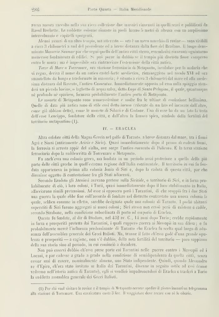 Altra celebre città della Magna f.recia nel golfo ili Tarante, a breve disianza dal mare, ira i fiumi Agri e Sinni (aulicamente Aciris e Siris), Quasi imiiiediatameiilc dopo il pruno di rodenti limili, la ferrovia si arresta appiè del lialto, ove sorge l'antico convento di l'olicoio. E la terza stazione ferroviaria dopo la sudiloscrilta di Torrcmare o Metaponto.