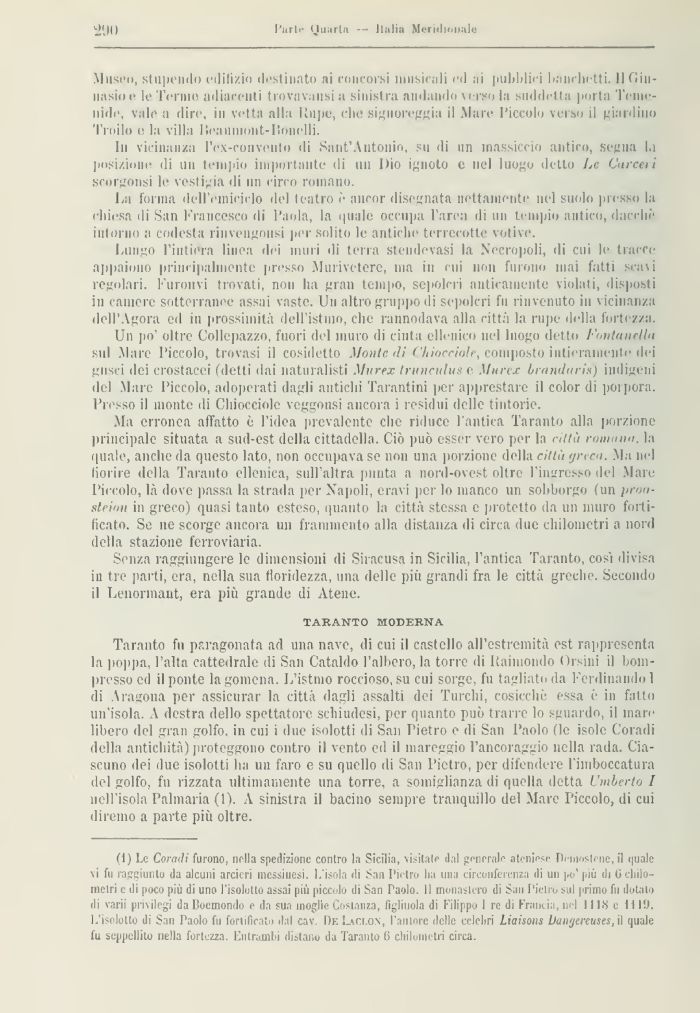 a cura di Federico Adamoli Aderisci al progetto! l'ari»* Quurlfl — ] 1 alia Mfflri hi vicinanza l'ex-coiivento ili Sant'Antonio, su di un massiccio antico, segua l.i posizione di un tempio importante di un I>ìo ignoto e nel luo^o detto Le Cu rea i STorgonsi le vestigia di un cirro romano. I,m forma ilelIVinioirlo del I eatro <• ancor disegnata nettamenti' nel suolo presso la chiosa di San Francesco di l'aula, la quale occupa l'area di un tempio antico, darrlic intorno a codesta riuvengttiisa per solito le antiche terrerotte votive. Lungo l'intiera linea ilei muri di terra stemlevasi la Necropoli, di cui le tracco appaiono principalmente presso Murivotere, ma in cui non furono mai fatti scavi regolari. Furami trovati, non ha gran tempo, sepolcri anticamente violati, disposti in camere sotterranee assai vaste. Un altro gruppo di sepolcri fu rinvenuto ili vicinanza dell'Agora ed in prossimità dell istmo, che rannodava alla città la rupe della fortezza. Un po' oltre Colle-pazzo, fuori del muro di cinta ellenico nel luogo detto l'onta iifll'i sul Mare Piccolo, trovasi il cosidetto Monte di Chiocciole, composto iiitieraniente dei gusci ilei crostacei filetti dai naturalisti Murex trunculus e Mnrcx brnndiiris) indigeni del Mare Piccolo, adoperati dagli antichi Tarantini per apprestare il color di porpora. Presso il monte di Chiocciole veggonsi ancora i residui delle tintorie. Ma erronea affatto è l'idea prevalente clic riduce l'antica Taranto alla porzione principale situata a sud-est della cittadella. Ciò può esser vero per la al là voi» nm, la quale, anche da questo lato, non occupava se 11011 una porzione della città ynco. Ma nel liorire della Taranto ellenica, sull'altra punta a nord-ovest oltre I mpresso del Mare Piccolo, là dove passa la strada per Napoli, aravi per lo manco un sobborgo (un jjrmi-strimi in greco) quasi tanto esteso, quanto la città stessa e protetto da un muro fortificato. Se ne scorge ancora un frammento alla distanza di circa due chilometri a nord della stazione ferroviaria. Senza raggiungere le dimensioni di Siracusa in Sicilia, l'antica Taranto, così divisa in tre parti, era, nella sua floridezza, una delle più grandi fra le città greche. Secondo il Lenormant, era più grande di Atene. TARANTO MODERNA Taranto fu paragonata ad una nave, di cui il castello all'estremità est rappresenta la poppa, l'alta cattedrale di San Cataldo l'albero, la torre di Raimondo Orsini il bompresso ed il ponte la gomena. L'istmo roccioso, su cui sorge, fu tagliato da Ferdinando 1 di Aragona per assicurar la città dagli assalti dei Turchi, cosicché essa è. in fatto un'isola. A destra dello spettatore schiudesi, per quanto può trarre lo sguardo, il mari-libero del gran golfo, in cui i due isolotti di San Pietro e di San Paolo (le isole Coradi della antichità) proteggono contro il vento ed il mareggio l'ancoraggio nella rada. Ciascuno dei due isolotti ha un faro e su quello di San Pietro, per difendere l'imboccatura del golfo, fu rizzata ultimamente una torre, a somiglianza di quella detta Umberto I nell'isola Palmaria (1). A sinistra il bacino sempre tranquillo del Mare Piccolo, di cui diremo a parte più oltre. (1) Le Coradi furono, nella spedizione contro la Sicilia, visitati» ila) genrrnle stoni ¦<¦ Dcmoslcne, il ipiale vi fu «agl'imi» da alcuni arcieri messinesi, l 'isola di San Pietro Ita (ma circonferenza ili un po' più di G cliilo-melri e ili poco più di uno I isolotto assai più piccolo di San Paolo II monastero di San Pietro sul primo fu dotalo ili vani privilegi da Lìoemondo e da sua moglie Costanza, figliuola di Filippa 1 re di Francia,nel 1118 e ti 19. L'isolotto ili San Paolo fu fortificato dal cav. De L«xo\, l'amore delle celebri Liaisons UangeremtS, il quale fu seppellito nella fortezza. Entrambi disiano da Taranto 6 cliiiuWeM' circa. ![]() |