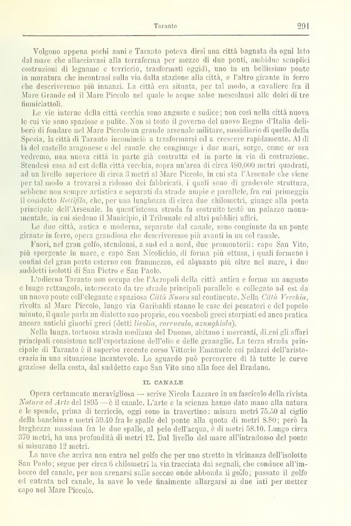 L'odierna Taranto non occupa che l'Acropoli della città antica e forma un angusto e lungo rettangolo, intersecato da tre strade principali parallele e collegato ad est da un nuovo ponte coH'elegante e spaziosa Città Nuova sul continente. Nella Città Vecchia, rivolta al Mare Piccolo, lungo via Garibaldi stanno le case dei pescatori e del popolo minuto., il quale parla ini dialetto suo proprio, con vocaboli greci storpiati ed anco pratica ancora antichi giuochi greci (detti ìivolia, cemtculo, azungliiola).