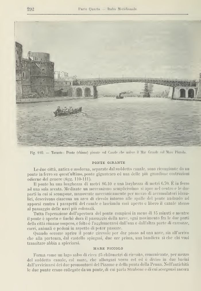 20-2 Fig. HO. — Taranto: Ponte (chiuso) girante sul Canale che unisce il Mar Grande col Alare Piccolo. PONTE GIRANTE Le due città, antica e moderna, separate dal suddetto canale, sono ricongiunte da un ponte in ferro su quest'ultimo, ponte gigantesco ed una delle più grandiose costruzioni odierne del genere (tigg. 110-111). Il ponte ha una lunghezza di metri SG.iO e una larghezza di metri 0.70. E in ferro ad una sola arcata. Mediante un meccanismo semplicissimo si apre nel centro e le due parti in cui si scompone, manovrate meccanicamente per mezzo di accumulatori idraulici, descrivono ciascuna un arco di circolo intorno alle spalle del ponte andando ad npporsi contro i parapetti del canale e lasciando così aperto e libero il canale stesso al passaggio delle navi più colossali. Tutta l'operazione dell'apertura del ponte compiesi in meno di lo minuti e mentre il ponte è aperto e finche dura il passaggio della nave, ogni movimento fra le due parti della città rimane sospeso, e folto è l'agglomerarsi dall'una e dall'altra parte di carrozze, carri, animali e pedoni in aspetto di poter passare. Quando occorre aprire il ponte girevole per dar passo ad una nave, sia all'arrivo che alla partenza, dal castello spiegasi, due ore prima, una bandiera si clic chi vuol transitare abbia a spicciarsi. MARE PICCOLO Forma come un lago salso di circa 2ó chilometri di circuito, comunicante, per mezzo del suddetto canale, col mare, che allungasi verso est ed e diviso in due bacini dall'avviciiiarsi dei due promontoni del Tizzone e della punta della Penna. Nell'antichità le due punte erano collegate da un ponte, di cui parla Strattone e di cui scorgonsi ancora ![]() |