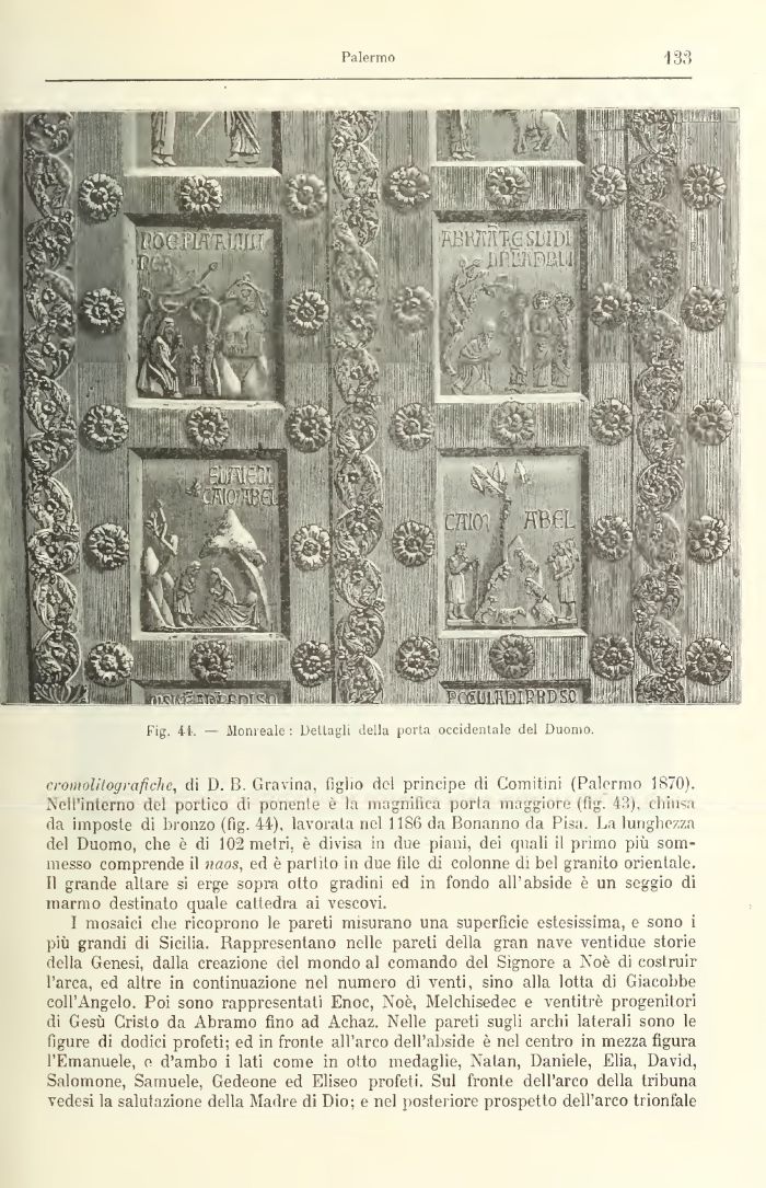 cromoli/ogi-afiche, di D. B. Gra\ina, figlio del principe dì Comitini (Palermo JSTO). Nell'interno del portico di ponente è la magnifica porta maggiore (fig. 43), chiusa da imposte di bronzo (fig. 44), lavorata nel 1186 da Bonanno da Pisa. La lunghezza del Duomo, che è di 102 metri, è divisa in due piani, dei quali il primo più sommesso comprende il naos, ed è partito in due filo di colonne dì bel granito orientale. (1 grande altare si erge sopra otto gradini ed in fondo all'abside è un seggio di marmo destinato quale cattedra ai vescovi.