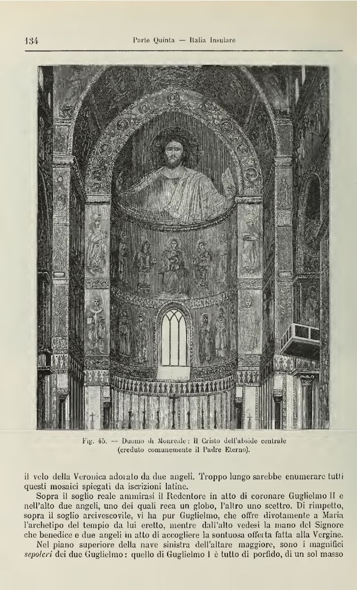Sopra il soglio reale ammirasi il Redentore in alto di coronare Guglielmo il e nell'alto due angeli, uno dei quali reca un globo, l'alilo imo scettro. Di riinpetto, sopra il soglio arcivescovile, vi ha pur Guglielmo, che offre divotainente a Maria l'archetipo del tempio da lui eretto, mentre dall'alto vedesi la mano del Signore che benedice e due angeli in atto di accogliere la sontuosa offerta fatta alla Vergine.