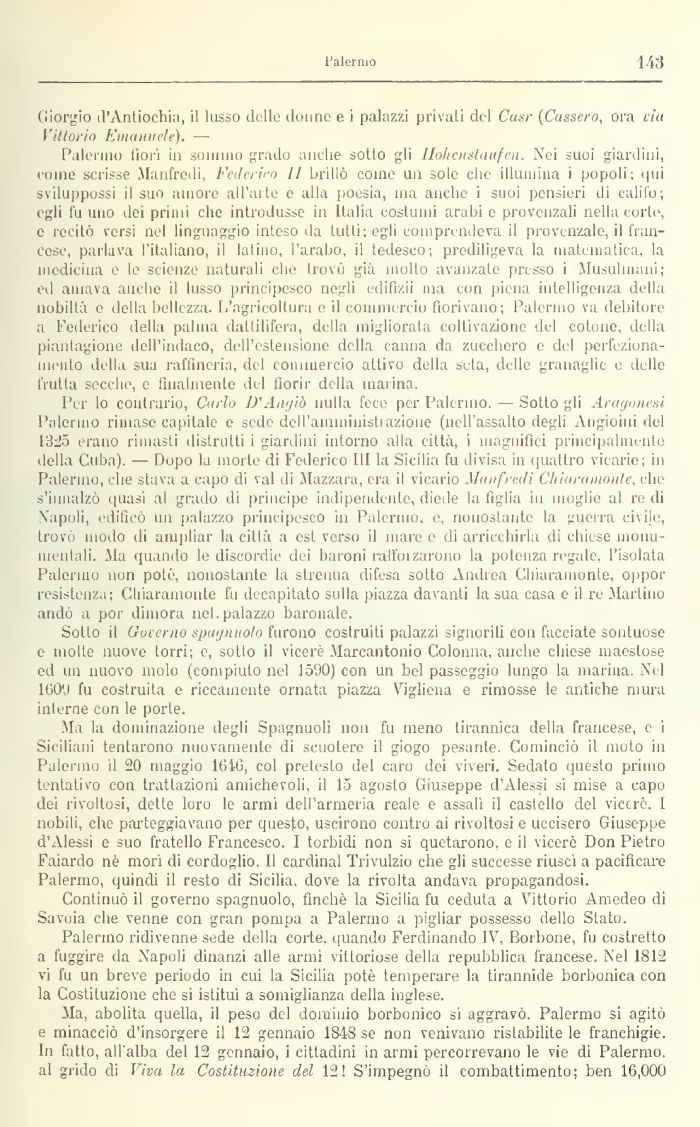 Palermo fiori in stimino grado anche sotto gli IfohemhUtfcn, Nei suoi giardini, come scrisse Manfredi, Federigo II brillò come un sole che illumina i popoli; qui sviluppossi il suo amore all'aite e alla poesia, ini anche i suoi pensieri di calilo; egli fu uno dei primi che introdusse in Italia costumi arabi e provenzali nella corte, e recitò versi nel linguaggio inteso da tutti; egli comprendeva il provenzale, il francese, parlava l'italiano, il latino, l'arabo, il tedesco; prediligeva la matematica, la medicina e le scienze naturali clic trovò già molto avanzate presso i Musulmani; ed amava anche il lusso principesca negli edifizii ina con piena intelligenza della nobiltà e della bellezza. L'agricoltura e il commercio fiorivano; Palermo va debitore a Federico della palina dattilifera, della migliorata coltivazione del cotone, della piantagione dell'indaco, dell'estensione della canna da zucchero e del perfezionamento della sua raffineria, del commercio attivo della seta, delle granaglie e delle frutta secche, e filialmente del fiorir della marina.