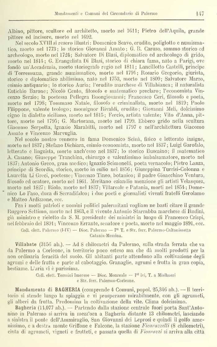 Bagheria (11.077 ab.). — Partendo dalla stazione centrale fuori porta Sant'Antonino in Palermo si arriva in mezz'ora a Bagheria distante 13 chilometri, lasciando a sinistra il ponte dell'Ammiraglio, San Giovanni dei Leprosi e quindi il golfo ame-nissimo, e a destra monte Griffone e Falcone, la stazione Ficarazzelli (8 chilometri), cinta di agrumeti, vigneti e frutteti, e passata quella di Ficarazzì si arriva alla città