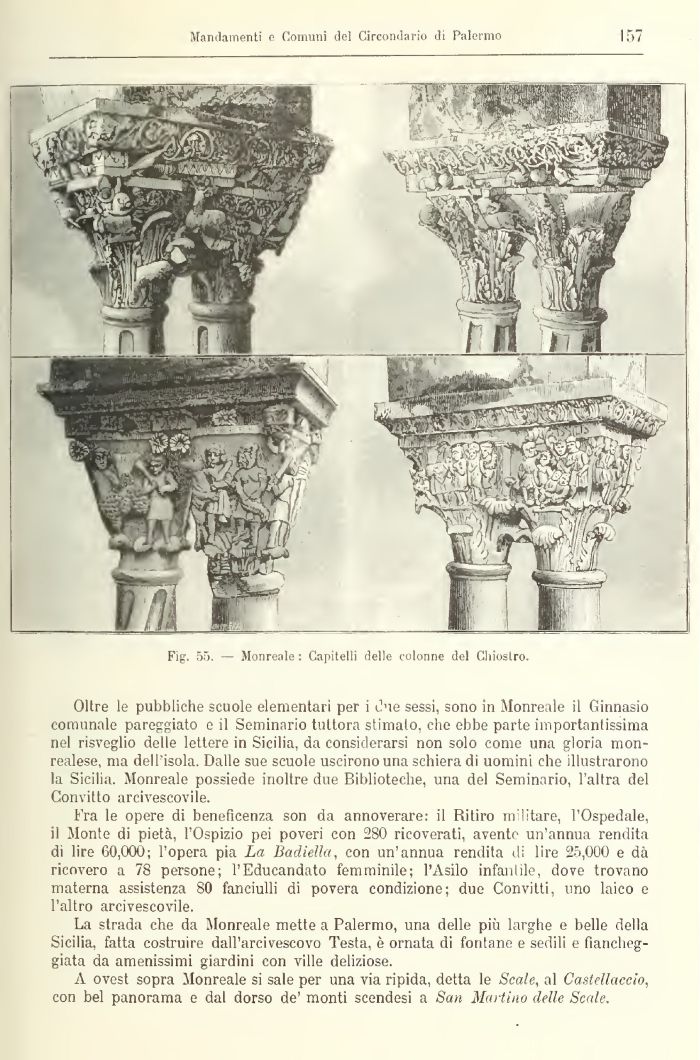 La strada che da Monreale mette a Palermo, una delle più larghe e belle della Sicilia, fatta costruire dall'arcivescovo Testa, è ornata di fontane e sedili e fiancheggiata da amenissimi giardini con ville deliziose.