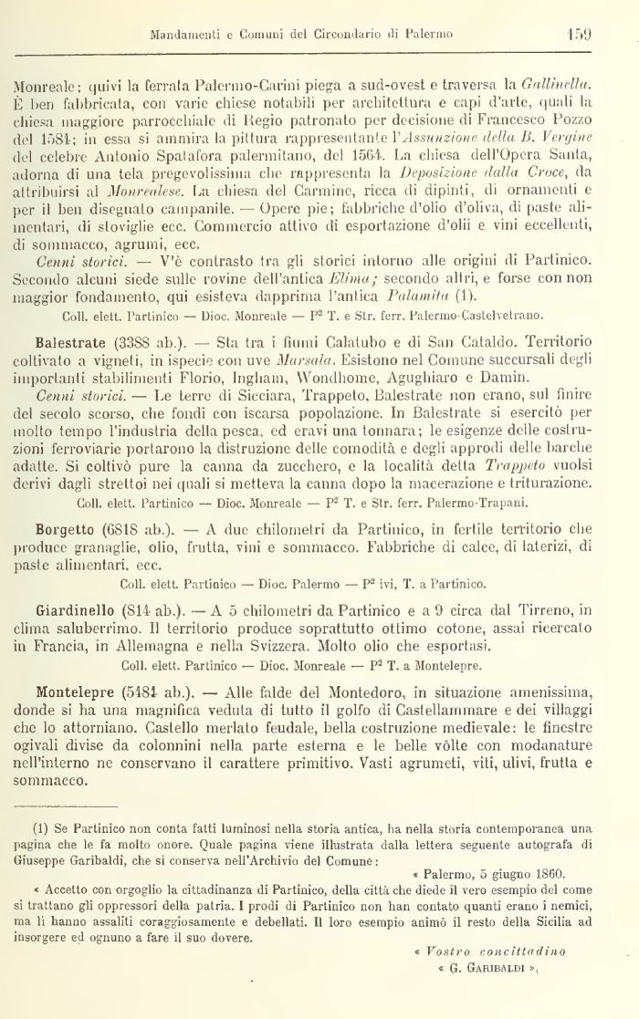 (1) Se Partinico non conta fatti luminosi nella storia antica, ha nella storia contemporanea una pagina che le fa molto onore. Quale pagina viene illustrata dalla lettera seguente autografa di Giuseppe Garibaldi, che si conserva nell'Archivio del Comune :
