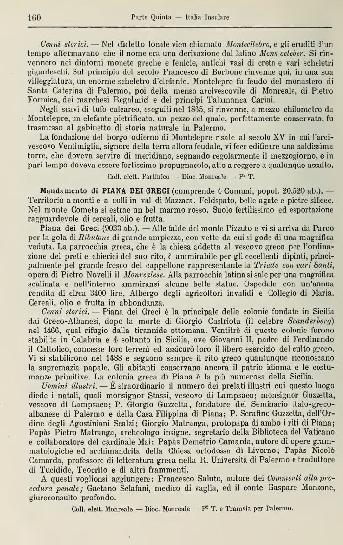 Uomini illustri. — È straordinario il numero dei prelati illustri cui questo luogo diede i natali, quali monsignor Stassi, vescovo di Lampsaco; monsignor Gozzetta, vescovo di Lampsaco; P. Giorgio Guzzetfa, fondatore del Seminario italo-greco-albanese di Palermo e della Casa Filippina di Piana; P. Serafino Guzzetta, dell'Ordine degli Agostiniani Scalzi; Giorgio Matranga, proto papa di ambo i riti di Piana; Papàs Pietro Matranga, archeologo insigne, segretario della Biblioteca del Vaticano e collaboratore del cardinale Mai; Papàs Demetrio Camarda, autore di opere gram-matologiche ed archimandrita della Chiesa ortodossa di Livorno; Papàs Nicolò Camarda, professore di letteratura greca nella R. Università di Palermo e traduttore di Tucidide, Teocrito e di altri frammenti.