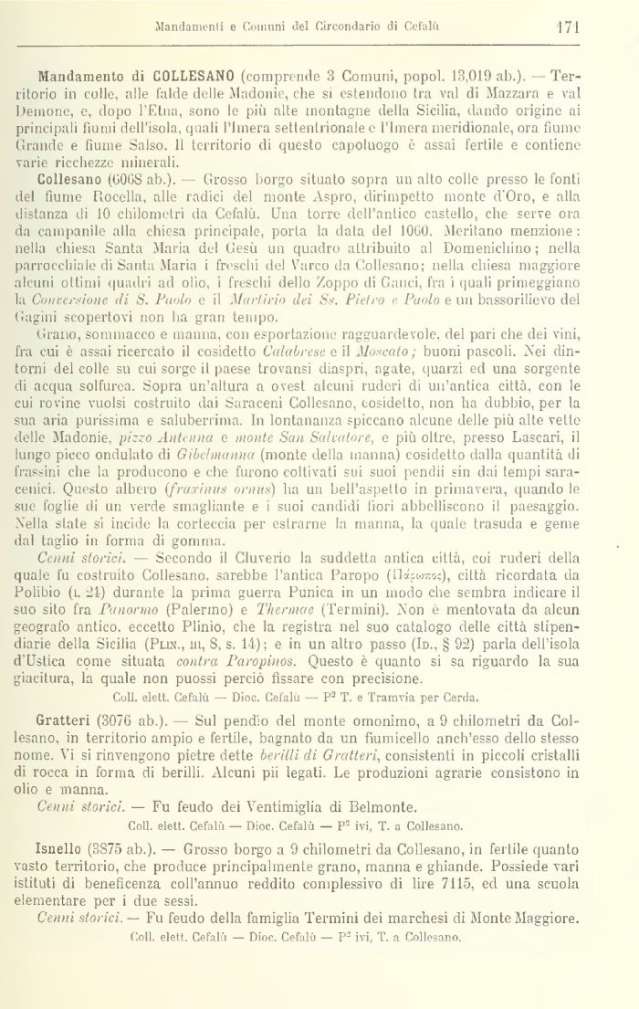 Mandamento di COLLESANO (comprende 3 Comuni, popol. 13,019 ah.). — Territorio in colle, alle falde delle Cladonie, che si estendono tra vai di Mazzara e vai Demone, e, dopo l'Etna, sono le più alte montagne della Sicilia, dando origine ai principali fiumi dell'isola, quali l'imera settentrionale e rimerà meridionale, ora fiume Grande e fiume Salso. 11 territorio di questo capoluogo è assai fertile e contiene varie ricchezze minerali.
