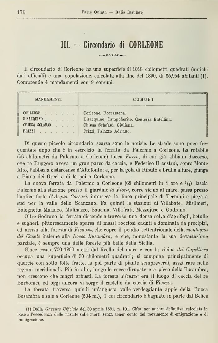 Il circondario di Corleone ha una superfìcie di 1048 chilometri quadrati (antichi dati ufficiali) e una popolazione, calcolata alla fine del 1890, di 05,954 abitanti (1). Comprende 4 mandamenti con 9 comuni.