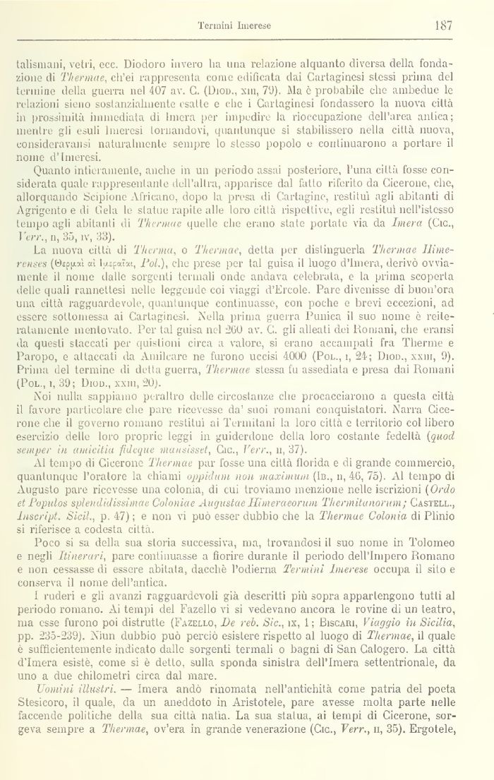 Quanto intieramente, anche m un periodo assai posteriore, l'una città fosse considerata quale rappresentante dell'altra, apparisce dal fallo riferito da Cicerone, che, allorquando Scipione Africano, dopo la presa di Cartagine, restituì agli abitanti di Agrigento e di Gela le statue rapite alle loro città rispettive, egli restituì nell'istesso tempo agli abitanti di Thennae quelle che erano slate porlate via da Imera (Cic., l'trr., n, 35, ìv, 33).