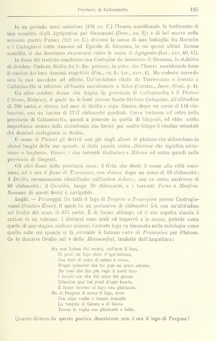 Laghi. — Primeggia fra tutti il lago di Pergusa o Proserpi ma presso Castrogio-vanni (l'antico Ernia), il quale ha un perimetro di chilometri 5.6, con un'altitudine sul livello del mare di 674 metri. E di forma oblunga ed il suo aspetto simula il cratere di un vulcano. 1 dintorni sono aridi ed impervii e le acque, putride come quelle di uno stagno, esalano miasmi. Codesto lago va rinomato nella mitologia come quello sulle cui sponde si fa avvenire il famoso ratto di Proserpina per Plutone. Ce lo descrive Ovidio nel v delle Metamorfosi, tradotte dall'Anguillaia:;