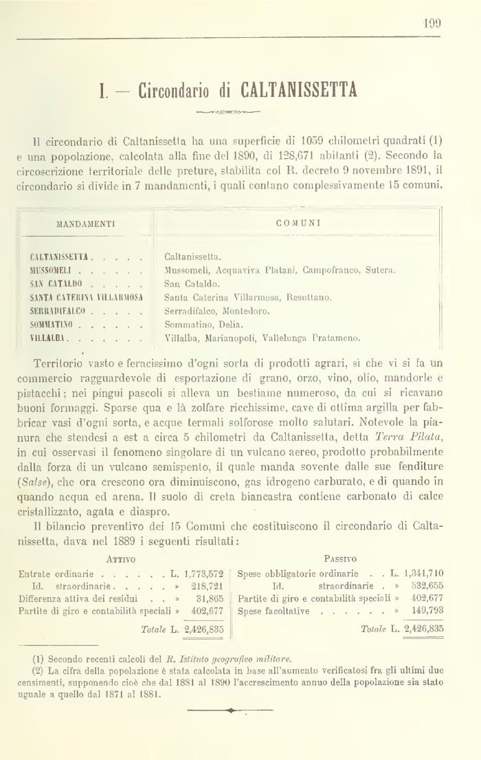 Il bilancio preventivo dei 15 Comuni che costituiscono il circondario di Caltanissetta, dava nel 1889 i seguenti risultati :