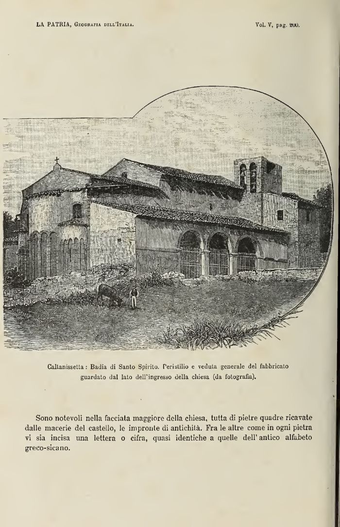 Caltanissetta . Badia di Santo Spirito. Peristilio e veduta generale del fabbricato guardato dal lato dell'ingresso della chiesa (da fotografia).