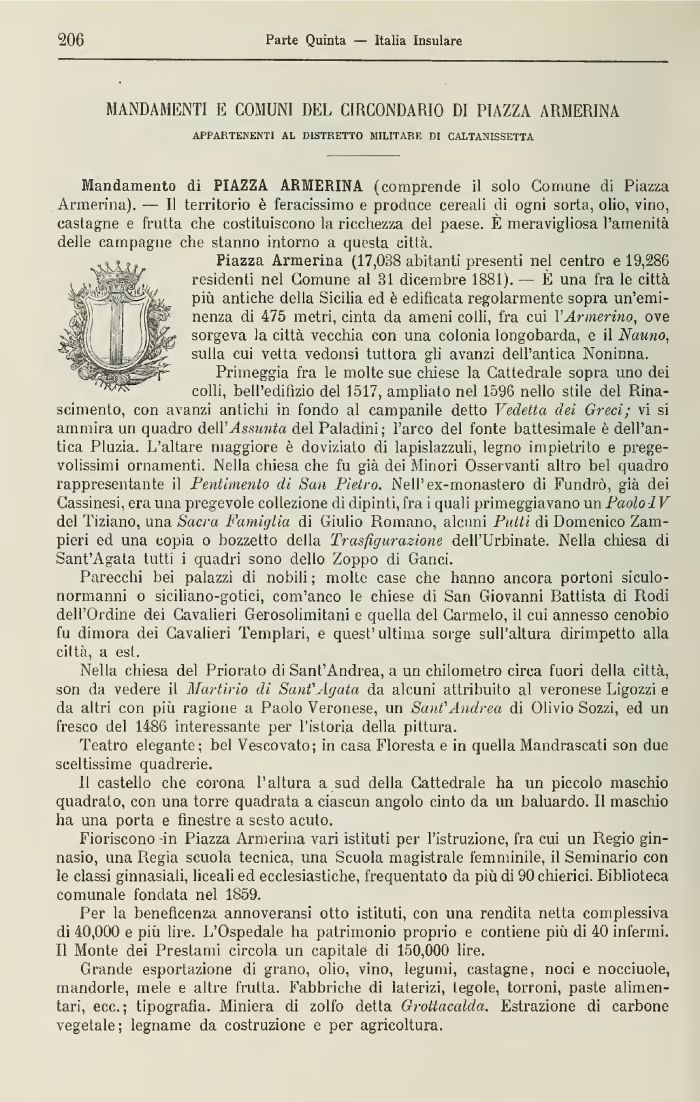Piazza Armerina (17,038 abitanti presenti nel centro e 19,286 residenti nel Comune al 3t dicembre 1881). — È una fra le città più antiche della Sicilia ed è edificata regolarmente sopra un'eminenza di 475 metri, cinta da ameni colli, fra cui VAnnerino, ove sorgeva la città vecchia con una colonia longobarda, e il Nauno, sulla cui vetta vedonsi tuttora gli avanzi dell'antica Noninna.