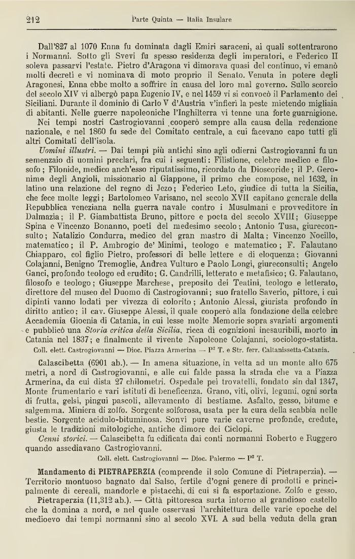 Uomini illustri, — Bai tempi più antichi sino agli odierni Castro giovanni fu un semenzaio di uomini preclari, fra cui i seguenti ; Filisi ione, celebre medico e filosofo ; Fìlonide, medico anch'esso riputatissimo, ricordato da Dioscoride; il P. Geronimo degli Angioli, missionario al Giappone, il primo che compose, nel 1632, in latino una relazione del regno di Jezo ; Federico Leto, giudico eli tutta la Sicilia, che fece molte leggi; Bartolomeo Varisano, nel secolo XVII capitano generale della Repubblica veneziana nella guerra navale contro i Musulmani e provveditore in Dalmazia; il P. Giambattista Bruno, pittore e poeta del secolo XVIII; Giuseppe Spina e Vincenzo Bonanno, poeti del medesimo secolo ; Antonio Tusa, giureconsulto ; Natalizio Condurra, medico del gran mastro di Malta ; Vincenzo Nocillo, matematico; il P. Ambrogio de'Minimi, teologo e matematico; F. Falautano Chiapparo, col figlio Pietro, professori di belle lettere e di eloquenza; Giovanni Colajanni, Benigno Tremoglie, Andrea Vulturo e Paolo Longi, giureconsulti; Angelo Ganci, profondo teologo ed erudito; G. Canditili, letterato e metafisico; G. Falautano, filosofo e teologo; Giuseppe Marchese, preposilo dei Teatini, teologo e letterato, direttore del museo del Duomo di Castrogiovanni ; suo fratello Saverio, pittore, i cui dipinti vanno lodati per vivezza di colorito ; Antonio Alessi, giurista profondo in diritto antico; il cav. Giuseppe Alessi, il quale cooperò alla fondazione della celebre Accademia Gioenia di Catania, in cui lesse molte Memorie sopra svariati argomenti e pubblicò una Storia critica delia Sicilia, ricca di cognizioni inesauribT, morto in Catania nel 1837; e finalmente il vivente Napoleone Colajarmi. sociologo-statista.