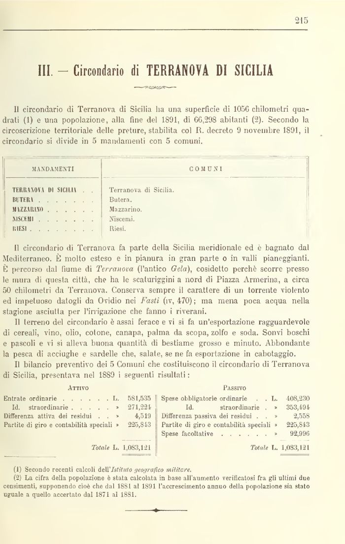 Il bilancio preventivo dei 5 Comuni che costituiscono il circondario di Terranova di Sicilia, presentava nel 18S9 ì seguenti risultati :