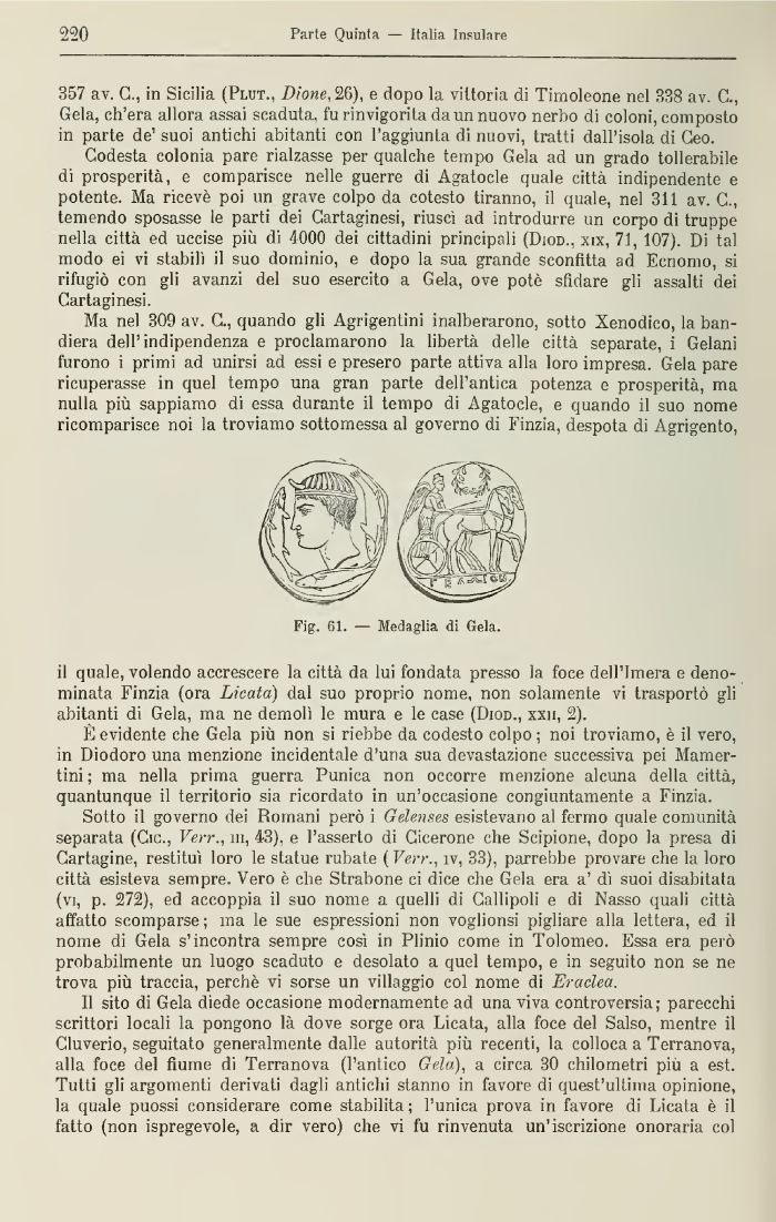 È evidente che Gola più non si riebbe da codesto colpo ; noi troviamo, è il vero, in Diodoro una menzione incidentale d'una sua devastazione successiva pei Mamer-tini ; ma nella prima guerra Punica non occorre menzione alcuna della città, quantunque il territorio sia ricordato in un'occasione congiuntamente a Finzia,
