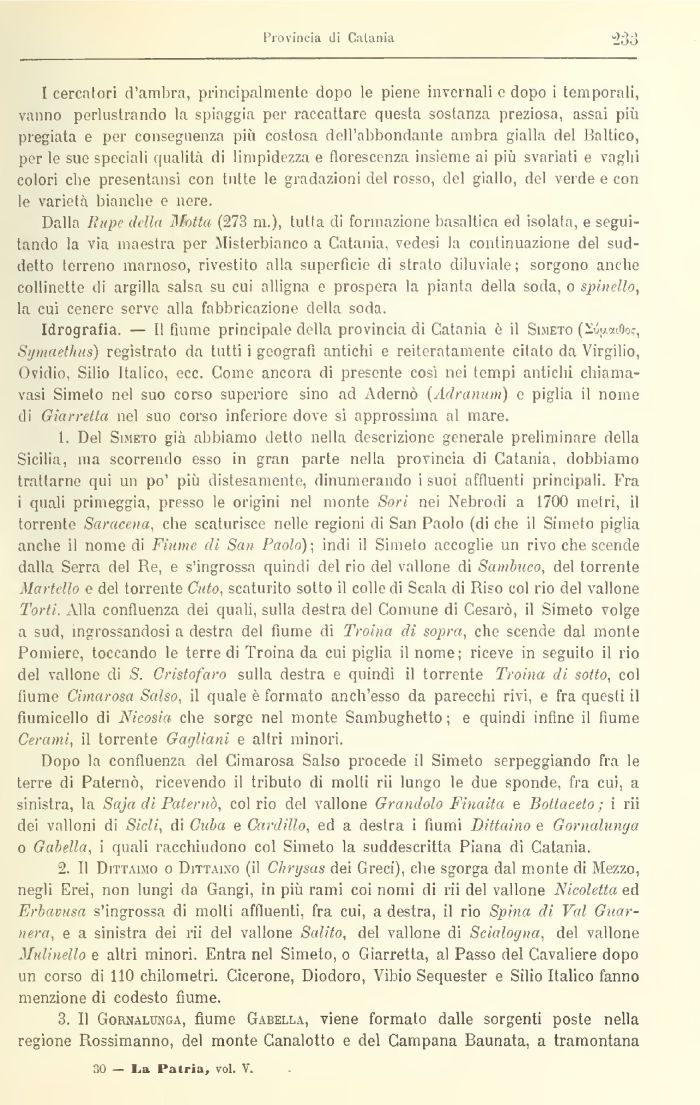 Idrografia — ti fiume principale della provincia di Catania è il Simeto (i)wcaOoc, Symmthus) registrato da tutti i geografi antichi e reiteratamente citato da Virgilio, Ovidio, Silio Italico, ecc. Come ancora di presente cosi nei tempi antichi chiama-vasi Simeto nel suo corso superiore sino ad Adornò (Adranum) e piglia il nome di Già fretta nel suo corso inferiore dove si approssima al mare.