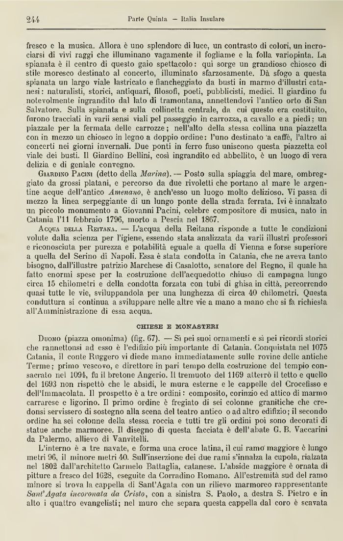 Duomo (piazza omonima) (fig. 67). — Sì pei suoi ornamenti e sì pei ricordi storici che rannettonsi ad esso è l'edilizio più importante di Catania. Conquistata nel 1075 Catania, il conte Ruggero vi diede mano immediatamente sulle rovine delle antiche Terme; primo vescovo, e direttore in pari tempo della costruzione del tempio consacrato nel 1094, fu il bretone Angerio. Il tremuoto del 1169 atterrò il tetto e quello del 1693 non rispettò che le absidi, le mura esterne e le cappelle del Crocefisso e dell'Immacolata. 11 prospetto è a tre ordini : composito, corinzio ed attico di marmo carrarese e ligorino. Il primo ordine è fregiato di sei colonne granitiche che cre-donsi servissero di sostegno alla scena del teatro antico o ad altro edifizio; il secondo ordine ha sei colonne della stessa roccia e tutti tre gli ordini poi sono decorati di statue anche marmoree. Il disegno dì questa facciata è dell'abate G. B. Vaccai ini da Palermo, allievo di Vanvitelli.