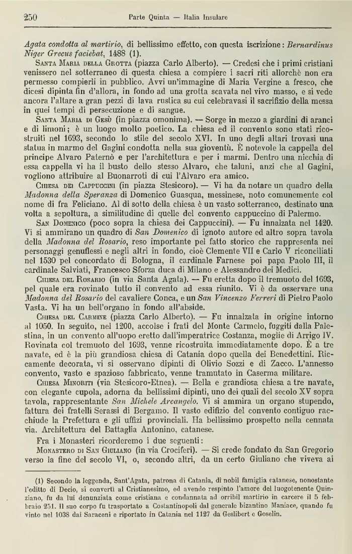 (1) Secondo la leggenda, Sant'Agata, patrona di Catania, di nobil famiglia catanese, nonostante l'editto di Decio, si convertì al Cristianesimo, ed avendo respinto l'amore del luogotenente Quin-ziano, fu da lui denunziata come cristiana e condannata ad orribil martirio in carcere il 5 febbraio 251. Il suo corpo fu trasportato a Costantinopoli dal generale bizantino Maniaco, quando fu vinto nel 103S dai Saraceni o riportato in Catania nel 1127 da Geslibert e Goselin.