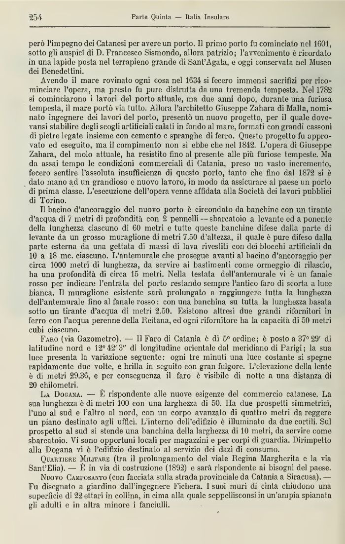 Avendo il mare rovinato ogni cosa nel 1G34 si fecero immensi sacrifizi per ricominciare l'opera, ma presto fu pure distrutta da una tremenda tempesta. Nel 1782 si cominciarono i lavori del porto attuale, ma due anni dopo, durante una furiosa tempesta, il nutre portò via lutto. Allora l'architetto Giuseppe Zahara di Malta, nominalo ingegnere dei lavori del porto, presentò un nuovo progetto, per il quale dove-vansi stabilire degli scogli artificiali calati in fondo al mare, formati con grandi cassoni di pietre legale insieme con cemento e spranghe dì ferro. Questo progetto fu approvato ed eseguito, ma il compimento non si ebbe clic nel 1842. L'opera di Giuseppe Zahara, del molo attuale, ha resistito fino al presente alle più furiose tempeste. Ma da assai tempo le condizioni commerciali di Catania, preso un vasto incremento, fecero sentire l'assoluta insufficienza di questo porto, tanto che fino dal 1872 si è dato mano ad un grandioso e nuovo lavoro, in modo da assicurare al paese un porto di prima classe. L'esecuzione dell'opera venne affidata alla Società dei lavori pubblici di Torino.