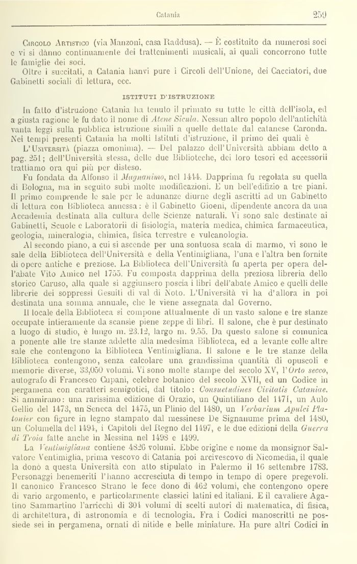 Il locale della Biblioteca si compone attualmente dì un vasto salone e tre stanze occupate intieramente da scansìe piene zeppe di libri. Il salone, che è pur destinato a luogo di studio, è lungo m. 23.12, largo in. 9.55. Da questo salone si comunica a ponente alle Ire stanze addette alla medesima Biblioteca, ed a levante colle altre sale che contengono la Biblioteca \ entimigliana. Il salone e le tre stanze della Biblioteca contengono, senza calcolare una grandissima quantità di opuscoli e memorie diverse, 33,050 volumi. Vi sono molte stampe del secolo XV, V Orto secco, autografo di Francesco Cu pani, celebre botanico del secolo XVIf, ed un Codice in pergamena con caratteri seniigotiei, dal tìtolo: Consuetuclines Civitatis Catauiae. Si ammirano: una rarissima edizione di Orazio, un Quintiliano del 1171, un Aulo Gellio del 1473, un Seneca del 1475, un Plinio del 1480, un Veròarium Apulci Tla-tonier con figure in legno stampato dal messinese De Signauume prima del 14b0, un Columella del 1494, i Capitoli del Regno del 1497, e le due edizioni della Guerra di Troia fatte anche in Messina nel 1498 e 1499.