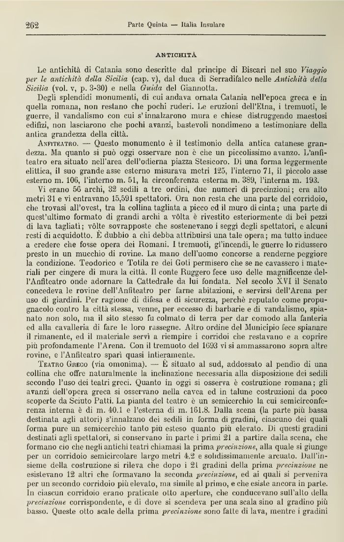 Anfiteatro. — Questo monumento è il testimonio della antica catanese grandezza. Ma quanto si può oggi osservare non ò che un piccolissimo avanzo. L'anfiteatro era situato nell'area dell'odierna piazza Stesicoro. Di una forma leggermente elittica, il suo grande asse esterno misurava metri 125, l'interno 71, il piccolo asse esterno ni. 100, l'interno m. 51, la circonferenza esterna ni. 389, l'interna m. 193.