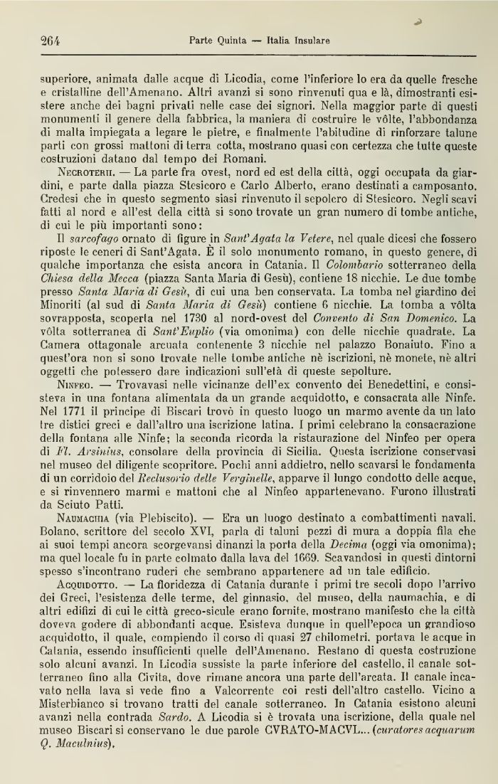 Ninfeo, — Trovavasi nelle vicinanze dell'ex convento dei Benedettini, e consisteva in una fontana alimentata da un grande acquidotto, e consacrata alle Ninfe. Nel 1771 il principe di Biscari trovò in questo luogo un marmo avente da un lato tre distici greci e dall'altro una iscrizione latina. I primi celebrano la consacrazione della fontana alle Ninfe; la seconda ricorda la ristaurazione del Ninfeo per opera di FI. Arsiuius, consolare della provincia di Sicilia. Questa iscrizione conservasi nel museo del diligente scopritore. Pochi anni addietro, nello scavarsi le fondamenta di un corridoio del Reclusorio delle Verginelle, apparve il lungo condotto delle acque, e si rinvennero marmi e mattoni che al Ninfeo appartenevano. Furono illustrati da Sciuto Patti.