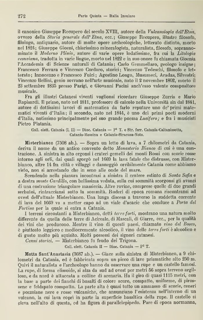 Misterbianco (7508 ab.). — Sopra un letto di lava, a 7 chilometri da Catania, deriva il nome da un antico convento detto Monasterio Bianco di cui è una contrazione. A sinistra in alto ergonsi i crateri gemelli de: monti Rossi con scorie rosse intorno agli orli, dai quali sgorgò nel 1669 la lava fatale che distrusse, con Mister-bianco, altre 14 fra città e villaggi e danneggiò orribilmente Catania come abbiamo visto, non si arrestando che in seno alle onde del mare.
