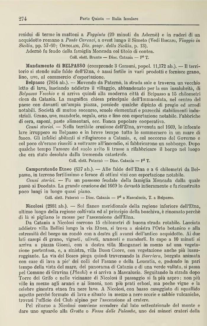 Nicolosi (2881 ab.). — Sul fianco meridionale della regione inferiore dell'Etna, ultimo luogo della regione coltivata ed al principio della boschiva, è rinomato perchè dì là si pigliano le mosse per l'ascensione dell'Etna.
