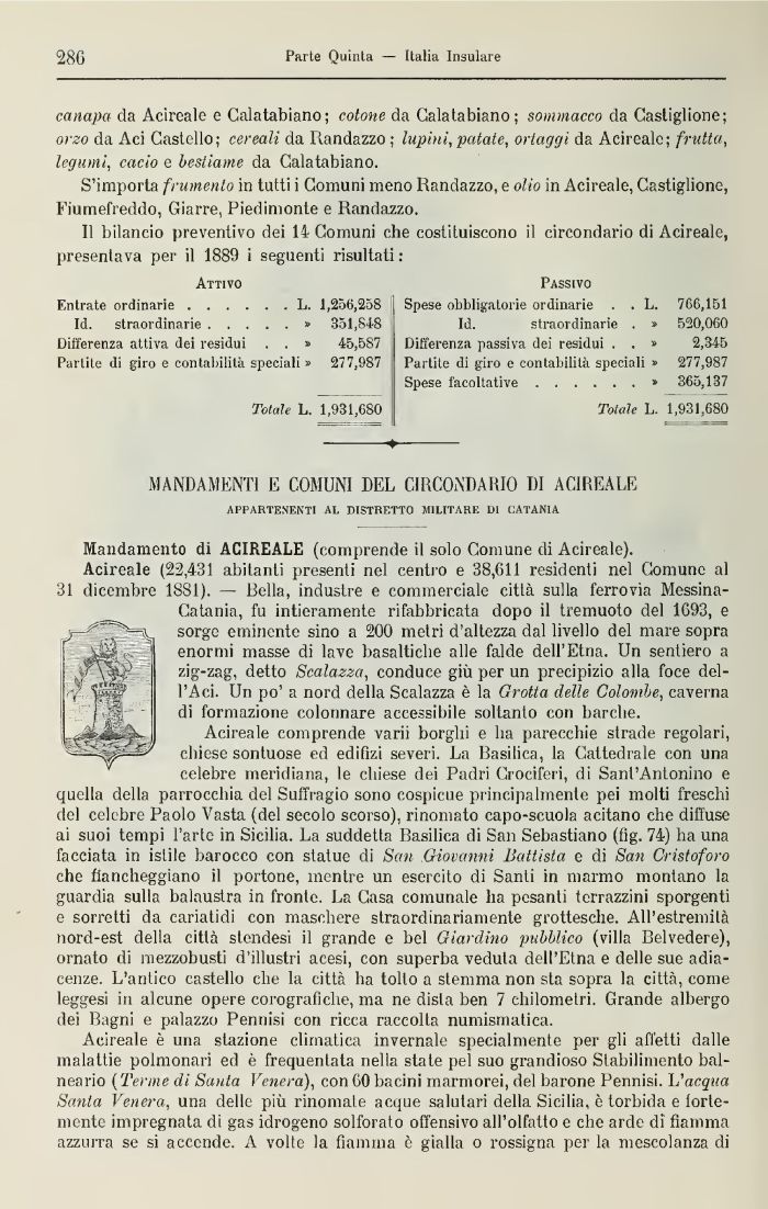 Il bilancio preventivo dei ti Comuni che costituiscono il circondario di Acireale, presentava per il 1889 i seguenti risultati: