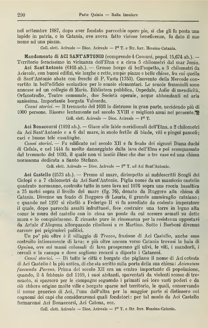 Aci Sant'Antonio (6165 ab.) — Grosso borgo di bell'aspetto, a 3 chilometri da Acireale, con buoni edilizi, vie larghe e rette, ampie piazze e belle chiese, fra cui quella di Sant'Antonio abate con freschi di P. ;Tasta (1753). Convento della Mercede convertito in bell'edificio scolastico per le scuole elementari. Le scuole femminili sono annesse ad un collegio di Maria. Biblioteca pubblica, Ospedale, Asilo di mendicità, Orfanotrofio, Teatro comunale, due Società operaie, acque abbondanti ed aria sanissima. Importante borgata Valverde.