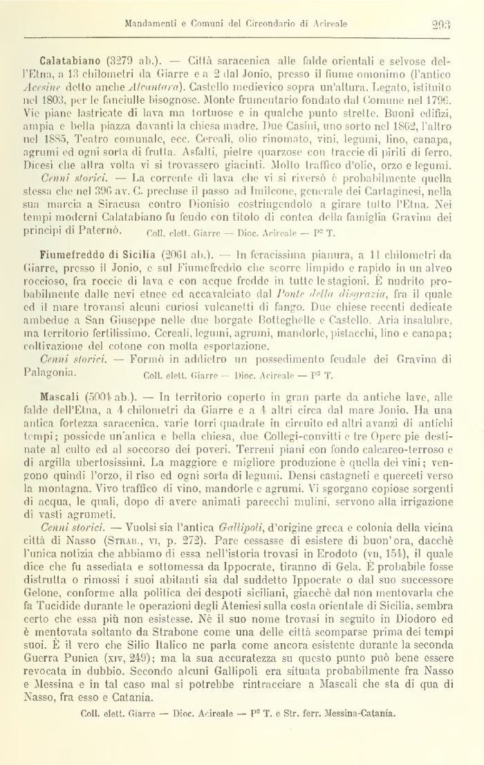 Cenni storici. — La corrente di lava che vi si riversi è probabilmente quella stessa che nel 396 av. G. precluse il passo ad Iniilcone, generale dei Cartaginesi, nella sua marcia a Siracusa contro Dionisio costringendolo a girare tolta l'Etna. Nei tempi moderni Calatabiano fu feudo con titolo di contea della famiglia Gravina dei principi di Paterno. Cnll cloU. Gi:lrre __ Di(re> Acireale — P2 T.