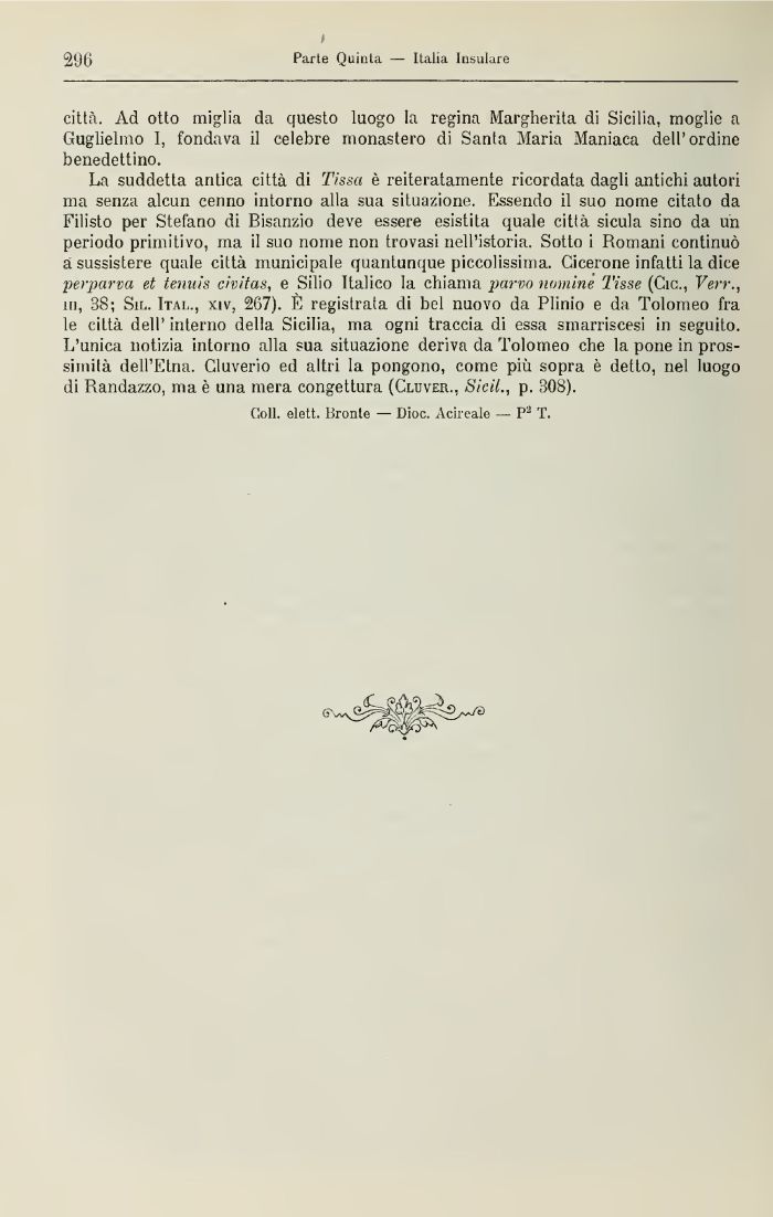 La suddetta antica città di Tissci è reiteratamente ricordata dagli antichi autori ma senza alcun cenno intorno alla sua situazione. Essendo il suo nome citato da Filisto per Stefano di Bisanzio deve essere esistita quale città sicula sino da un periodo primitivo, ma il suo nome non trovasi nell'istoria. Sotto i Romani continuò a sussistere quale città municipale quantunque piccolissima. Cicerone infatti la dice •pei-parva et tennis civitas, e Silio Italico la chiama parvo nomine Tinse (Cic., Verr., m, 38; Sil. Ital., xiv, 267). È registrata di bel nuovo da Plinio e da Tolomeo fra le città dell' interno della Sicilia, ma ogni traccia di essa smarriscesi in seguito. L'unica notizia intorno alla sua situazione deriva da Tolomeo che la pone in prossimità dell'Etna. Cluverio ed altri la pongono, come più sopra è detto, nel luogo di Randazzo, ma è una mera congettura (Cluveii., SieiL, p. 308).