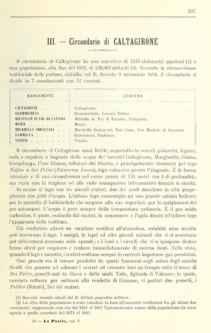 Il circondario di Callagirone assai feri ile, sopra tutto in cereali, pistacchi, legumi, soda e regolizia e bagnato dalle acque dei torrenti Callagirone, Margherita, Corna, Gornaluiiga, Pane Bianco, tributari del Si meta, è principalmente rinomato pel lago Naftia o dei l'alici (Palicorum Laciis), lago vulcanico presso Patagonia. E di forma circolare e di una circonferenza nel verno persili di 150 metri con ì di profondità ; ma varia con la stagione ed alle volte scomparisce intieramente durante la siccità.