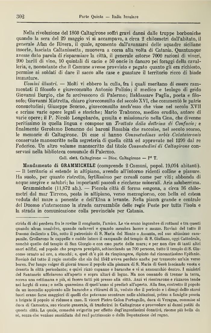 Uomini illustri, — Molti vi ebbero la culla, fra i quali meritano di essere rammentati il filosofo e giureconsulto Antonio Polizio; il medico e teologo di grido Giovanni Burgio, che fu arcivescovo di Palermo; Baldassare Paglia, poeta e filosofo; Giovanni Mistretta, chiaro giureconsulto del secolo XVI, che commentò le patrie consuetudini; Giuseppe Scorno, giureconsulto anch'esso che visse nel secolo XVII e scrisse varie opere legali e storiche; Mario Trabucco, medico erudito, autore di varie opere ; il P. Nicolò Longobardo, gesuita e missionario nella Cina, che divenne peritissimo in quella lingua e compose un Trattato della dottrina di Confucio; e finalmente Gerolamo Bonanno dei baioni Rosabìa che raccolse, nel secolo scorso, le memorie di Caltagirone. Di esse si hanno Consuetudines urbis Calataieronis conservate manoscritte nella segreteria di quella città ed approvate nel 1299 dal re Federico. Un altro volume manoscritto dal titolo Consuetudini di Caltagirone conservasi nella biblioteca comunale di Palermo.