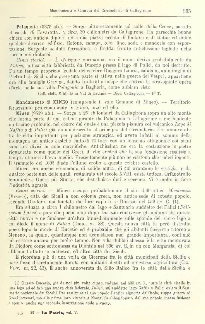 Mineo (9519 ab.). — Sorge a 25 chilometri da Caltagirone sopra un alto monte che forma parte di una catena girante da Patagonia a Caltagirone e racchiudente un bacino profondo, nel centro del (piale è una piccola pianura col vulcanico Lago eli Naftia o di Palici già da noi descritto al principio del circondario. Era annoverata fra le città importanti per posizione strategica ed aveva infatti al sommo della montagna un antico castello cinto di 12 torri con un maschio ottagonale coi piani superiori divisi in aule magnifiche. Antichissima ne era la costruzione m pietre riquadrate come quelle dei Greci, di che credesì che la sua fondazione risalisse a tempi anteriori all'evo medio. Presentemente più non ne esistono che ruderi ingenti Il Iremuoto del 1093 diede l'ultimo crollo a questo celebre castello.