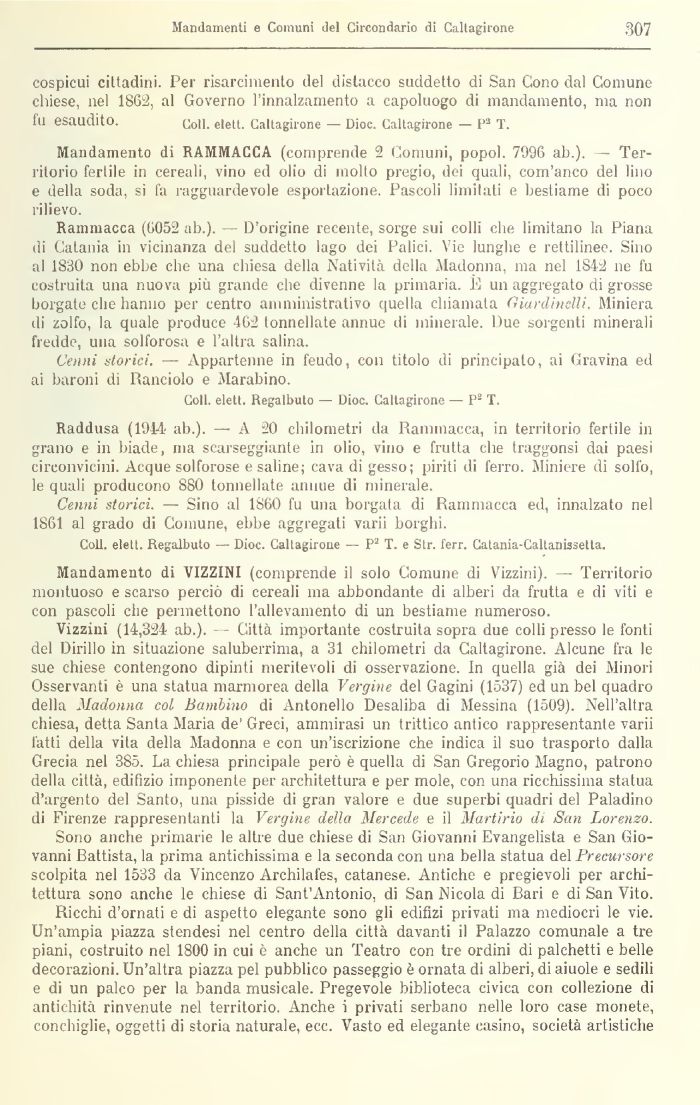 Vizzini (14,324 ab.).*-* Città importante costruita sopra due colli presso le fonti del Dirillo in situazione saluberrima, a 31 chilometri da Caltagirone. Alcune fra le sue chiese contengono dipinti meritevoli di osservazione, in quella già dei Minori Osservanti è una statua marmorea della Vergine del Gagini (1537) ed un bel quadro della Madonna col. Bambino di Antonello Desaliba di Messina (1509). Nell'altra chiesa, detta Santa Maria de'Greci, ammirasi un trittico antico rappresentante vani fatti della vita della Madonna e con un'iscrizione che indica ìl suo trasporto dalla Grecia nel 385. La chiesa principale però è quella di San Gregorio Magno, patrono della citlà, edilìzio imponente per architettura e per mole, con una ricchissima statua d'argento del Santo, una pisside di gran valore e due superbi quadri del Paladino di Firenze rappresentanti la Vergine della Mercede e il Martirio di San Lorenzo.