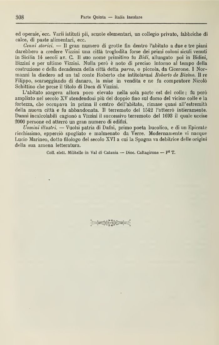 Cenni istorici. — Il gran numero di grotte fin dentro l'abitato a due e tre piani darebbero a credere Vizzini una città troglodita forse dei primi coloni siculi venuti in Sicilia 14 secoli av. G, Il suo nome primitivo fu Bidi, allungato poi in Bidini, Bizzini e per ultimo Vizzini. Nulla però è noto di preciso intorno al tempo della costruzione e della decadenza della città detta parva, o piccola, da Cicerone. I Normanni la diedero ad un tal conte Roberto che intitolavasi Roberto de Bigino. Il re Filippo, scarseggiando di danaro, la mise in vendita e ne fu compratore Nicolò Schittino che prese il titolo di Duca di Vizzini.