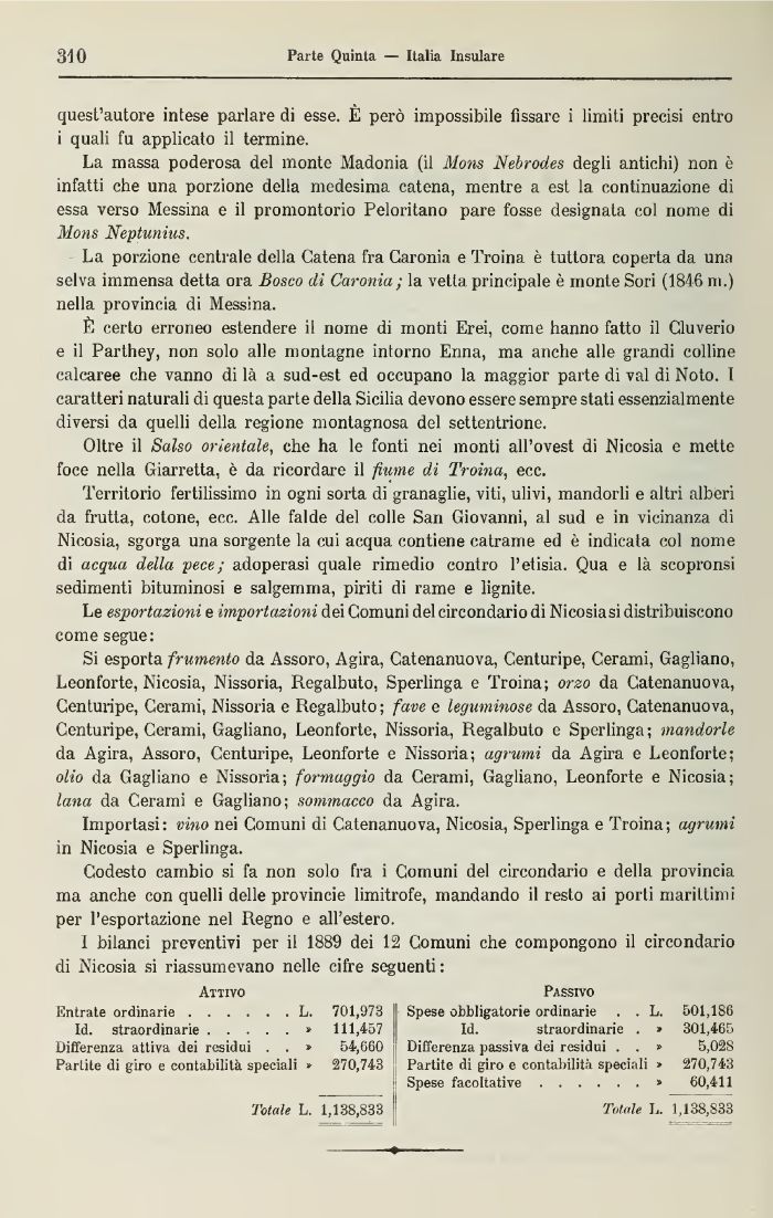 I bilanci preventivi per il 1889 dei 12 Comuni che compongono il circondario di Nicosia si riassumevano nelle cifre seguenti ;