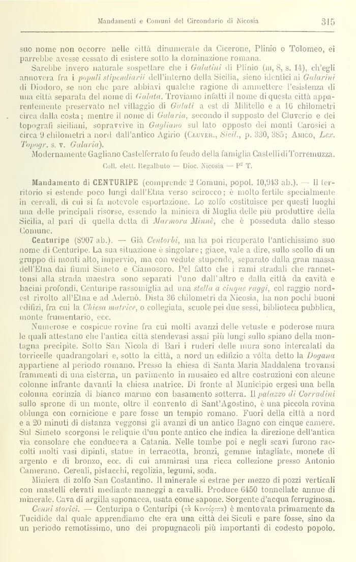 Sarebbe invero naturale sospettare che i Galatini di Plinio (in, 8, s. 14), ch'egli annovera fra i populi stipendiarti dell'interno della Sicilia, sieno identici ai Botarmi ili Diodoro, se non clie pare abbiavi qualche ragione di ammettere l'esistenza ili mia città separata del nome di (calata. Troviamo infatti il nome di questa città apparentemente preservato nel villaggio di Gaietti a est di Militello e a 10 chilometri circa dalla costa; mentre il nome di Gala ria, secondo il supposto del Cluverio e elei topograti siciliani, sopravvive in Gagliano sul lato opposto dei monti Carosici a circa 9 chilometri a nord dall'antico Agirio (GluverSiciL, p. 330,385; Amico, Lex. J'opogr. s. v. Galaria).