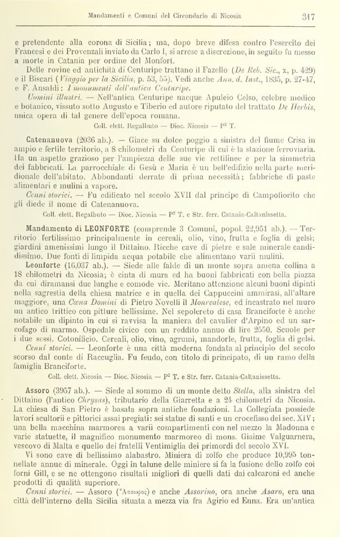 Assoro (3957 ab.). — Siede al sommo di un monte detto Stella, alla sinistra del Dittamo (l'antico Cìtrijsas), tributario della Giarretta e a 24 chilometri da Nicosia. La chiesa di San Pietro è basata sopra antiche fondazioni La Collegiata possiede lavori scultorii e pittorici assai pregiati : sei statue di santi e un crocefisso del sec. Xi V ; una bella macchina marmorea a varii compartimenti con nel mezzo la Madonna e varie statuette, il magnifico monumento marmoreo di mons. Giaime Valguarnera, vescovo di Malta e quello dei fratelli Ventimiglia dei primordi del secolo XVI.