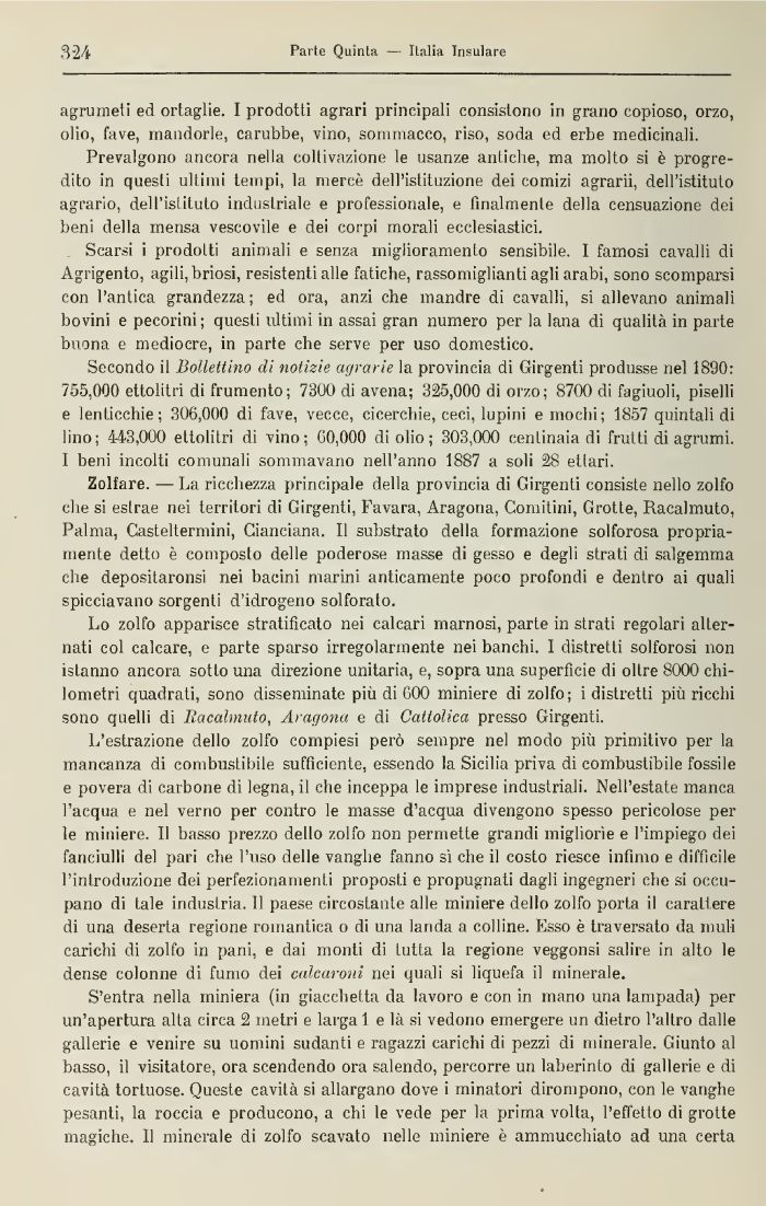Zolfare. — La ricchezza principale della provincia di Girgenti consiste nello zolfo che si eslrae nei territori di Girgenti, Favara, Aragona, Gomitini, Grotte, Racalmuto, Palma, Casteltermini, Ci ari ciana. Il substrato della formazione solforosa propriamente detto è composto delle poderose masse di gesso e degli strati di salgemma che depositaronsi nei bacini marini anticamente poco profondi e dentro ai quali spicciavano sorgenti d'idrogeno solforato.
