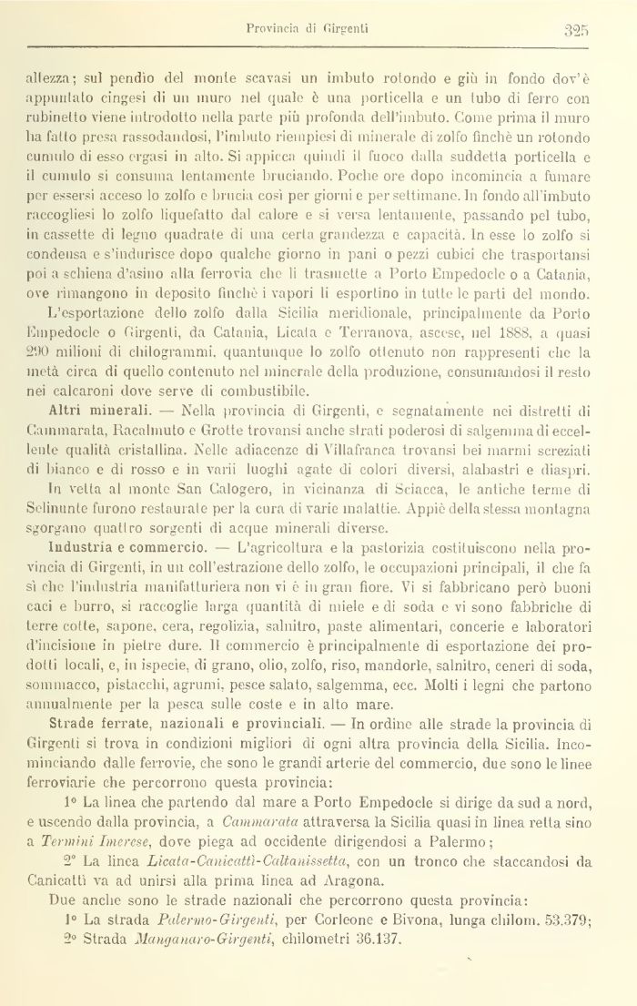 altezza; sul pendio del inorile scavasi un imbuto rotondo e giù in fondo dov'è appuntato cingesi di un muro nel quale ò una porticella e un tubo di ferro con rubinetto viene introdotto nella parte più profonda dell'imbuto. Come prima il muro ha fatto presa rassodandosi, l'imbuto riempiesi di minerale di zolfo finché un rotondo cumulo di esso ergas. in alto. Si appicca quindi il fuoco dalla suddetta porticella e il cumulo si consuma lentamente bruciando. Poche ore dopo incomincia a fumare per essersi acceso lo zolfo e brucia cosi per giorni e per settimane. In fondo all'imbuto raccogliesi lo zolfo liquefatto dal calore e si versa lentamente, passando pel tubo, in cassette di legno quadrate di una certa grandezza e capacità. In esse lo zolfo si condensa e s'indurisce dopo qualche giorno in pani o pezzi cubici che trasportatisi poi a schiena d'asino alla ferrovia che li trasmette a Porto Empedocle o a Catania, ove rimangono in deposito finché 1 vapori li esportino in tutte le patti del mondo.