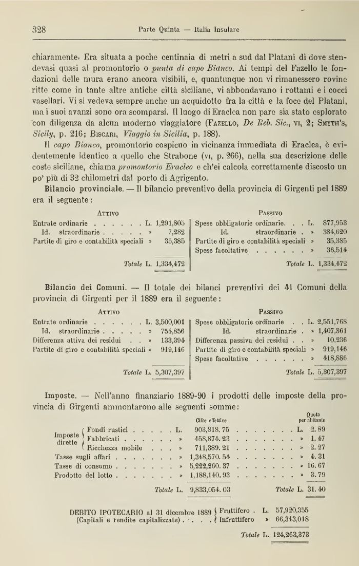 chiaramente. Era situata a poche centinaia di metri a sud dal Platani di dove sten-devasi quasi al promontori! o punta di capo Bianco. Ai tempi del Fazello le fondazioni delle mura erano ancora visibili, e, quantunque non vi rimanessero rovine ritte come iti tante altre antiche città siciliane, vi abbondavano i rottami e i cocci vasellan. Vi si vedeva sempre anche un acquidoso fra la città e la foce del Platani, ma i suoi avanzi sono ora scomparsi. Il luogo di Eraclea non pare sia stato esplorato con diligenza da alcun moderno viaggiatore (Fazello, De Beh. Sic., vi, 2; Smyth's, Sicily, p. 21f>; Biscari, Viaggio in Sicilia, p. 188).
